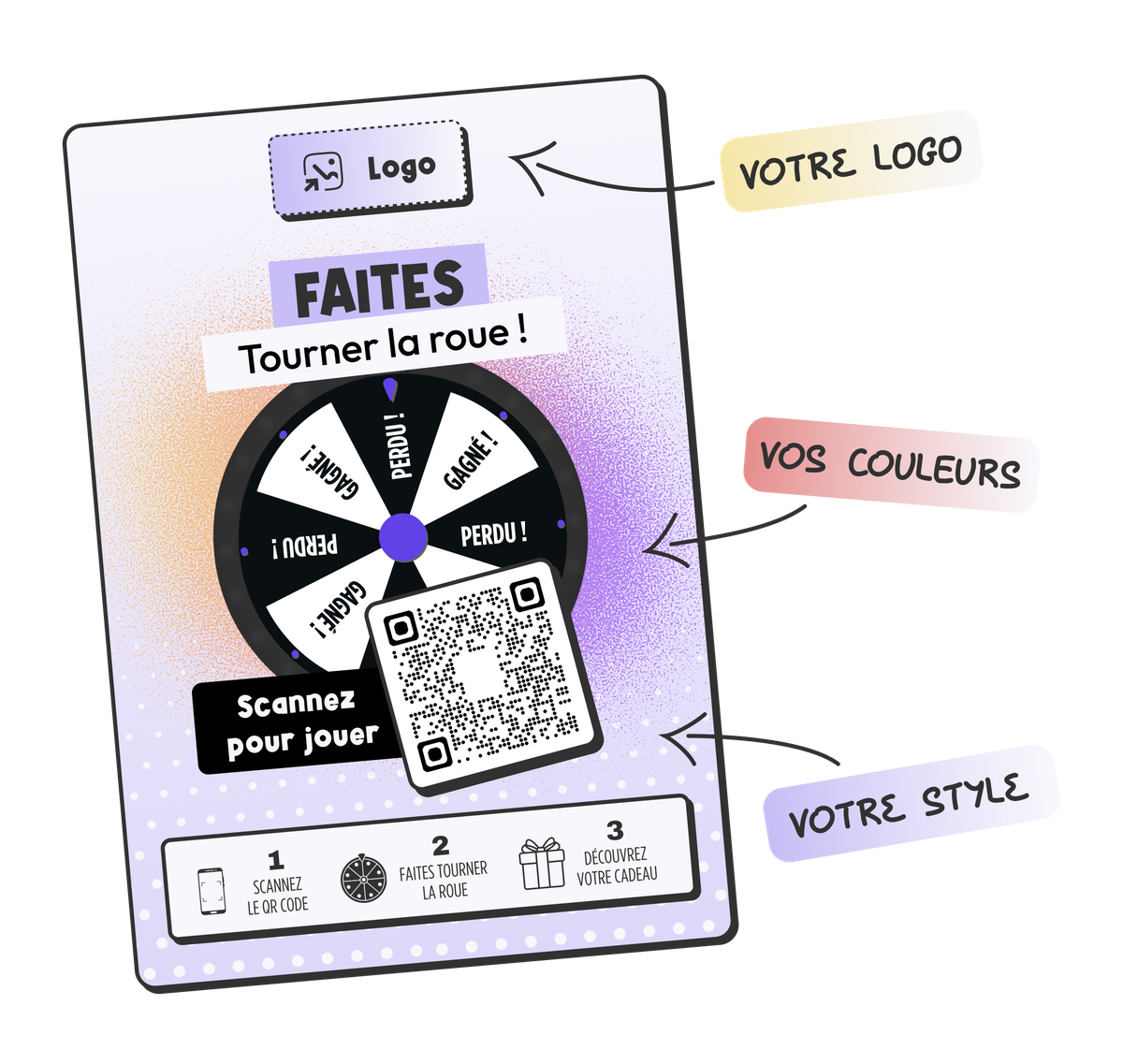 Tout se paramètre directement depuis votre espace : les conditions du jeu, les lots offerts, le design de la page de jeu et même le visuel de votre flyer. Nous avons simplifié chaque étape afin que vous puissiez configurer et lancer votre campagne de façon totalement autonome, sans dépendre de personne. En bref, vous gardez le contrôle du début à la fin.
