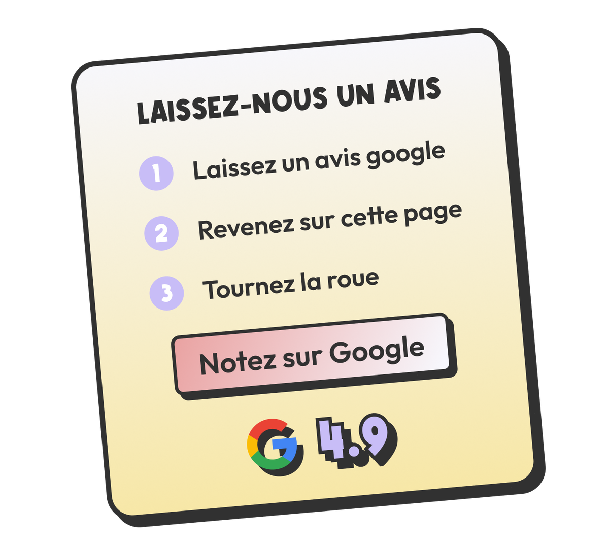 Avant de jouer, vos clients doivent vous donner un coup de pouce en ligne : avis Google ou action sur vos réseaux. Résultat ? Plus de visibilité et plus d’abonnés !