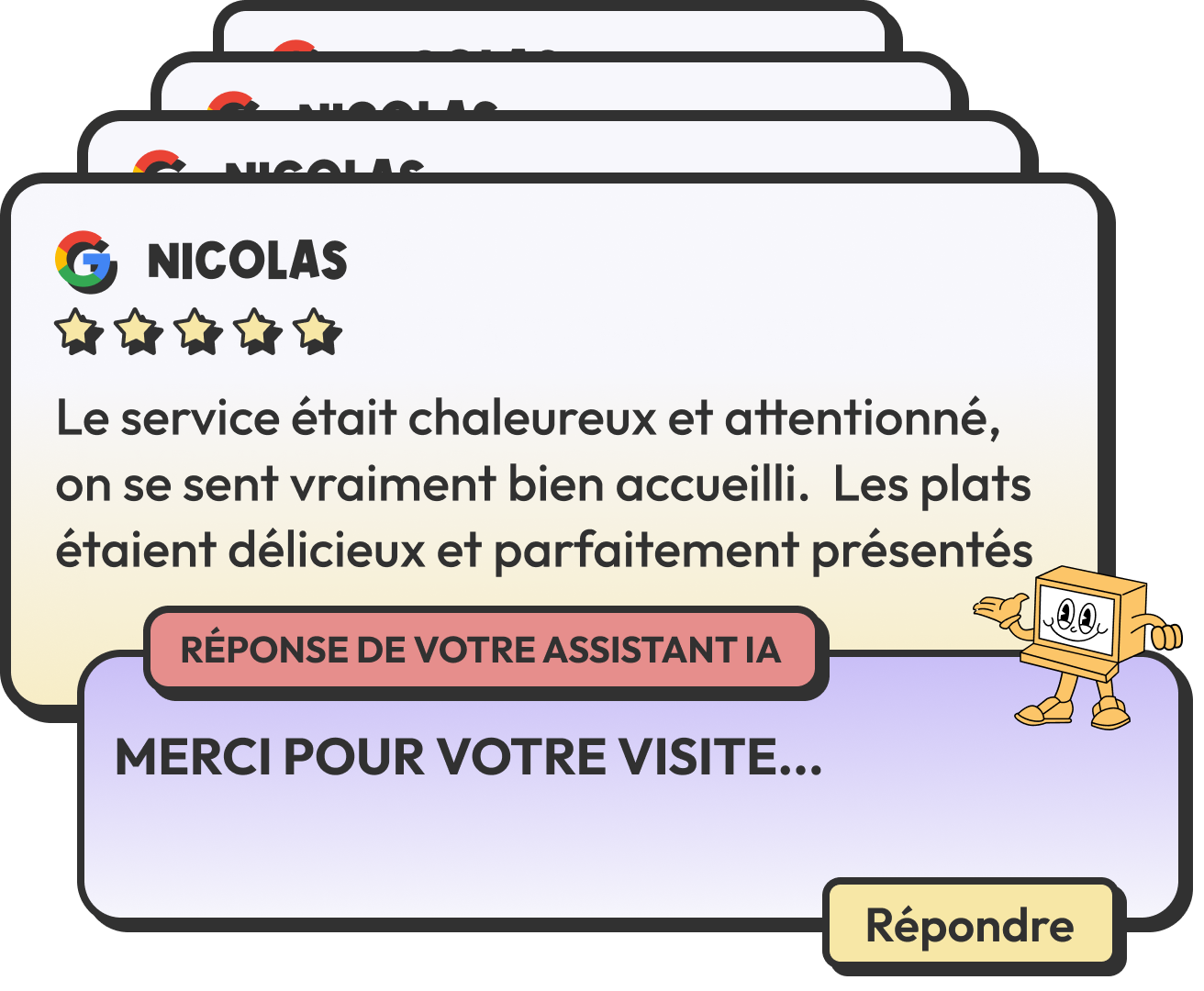 Gérez et analysez vos avis clients, automatisez vos réponses grâce à l’IA. Améliorez votre image de marque et renforcez votre visibilité locale… sans y passer vos journées.