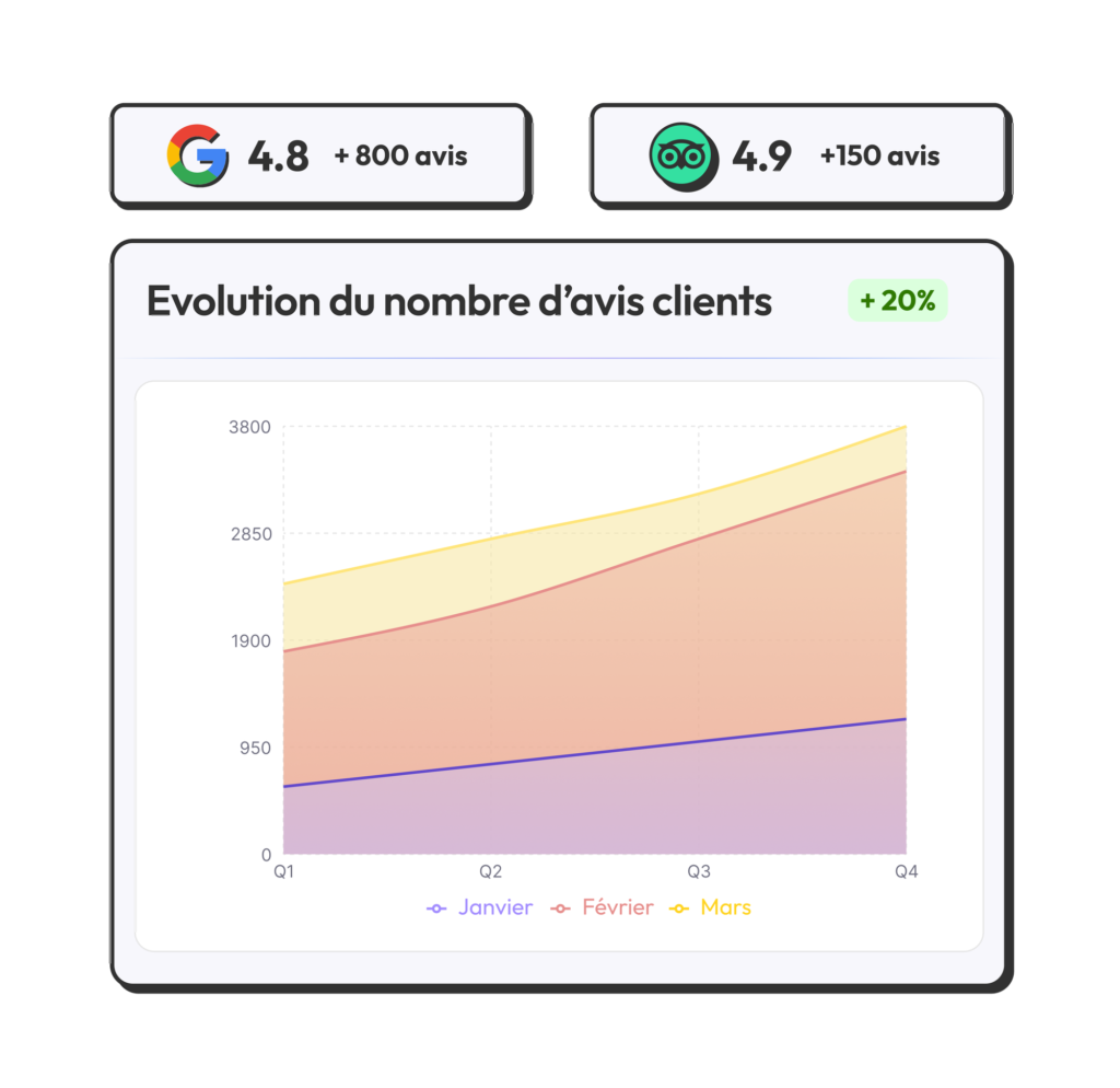 Regroupez tous vos avis client en un seul endroit, répondez facilement, suivez vos performances et gardez la main sur votre e-réputation. Simple, centralisé, maîtrisé.